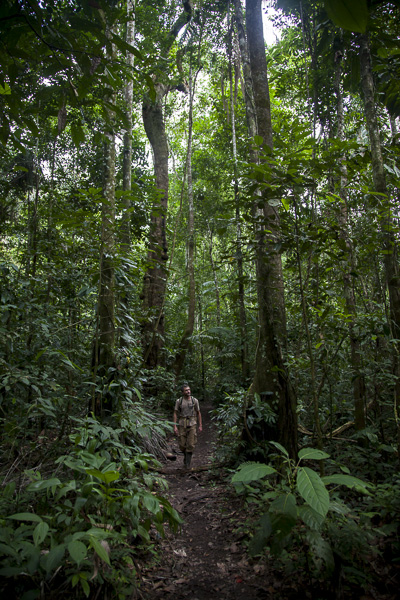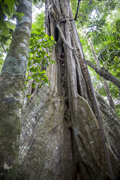 I photographed this three hundred year-old giant strangler fig deep in the jungle surrounded by other very tall trees such as a 600 year-old kapok tree. The strangler fig has developed an adaptation that helps it survive by growing seedlings in the crevices of other trees. The roots of these seedlings then grow downward and envelop the host tree while also growing upward to reach into the sunlight zone above the canopy. The host tree dies over many years and becomes hollow (and as result one can sometimes climb up its center as you'll see in this photo if you look closely!).