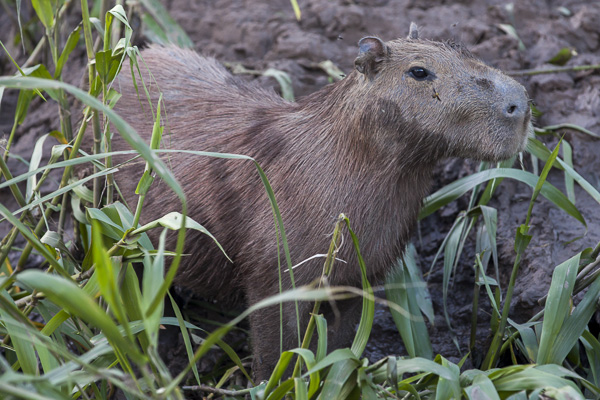 A capybara, the largest rodent in the world, forages for food on the banks of the Tambopata River. The rodent, which is related to the guinea pig, hangs out in groups of 20 or more animals. While it isn't endangered, the capybara is hunted for its meat, its hide and also for a grease from its thick fatty skin which is used in the pharmaceutical industry.