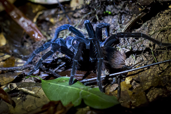 A juvenile “chicken spider” tarantula waits for prey outside its family’s den. This young tarantula,