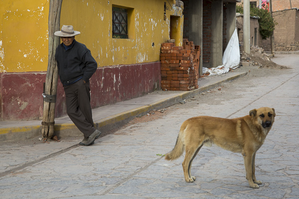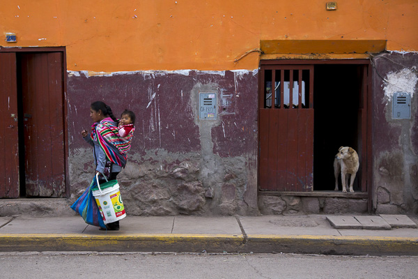 A dog seemingly enjoys being in the midst of the action on a street corner in Pisac. While he was clearly blocking the sidewalk, I didn't see anyone chase him away.