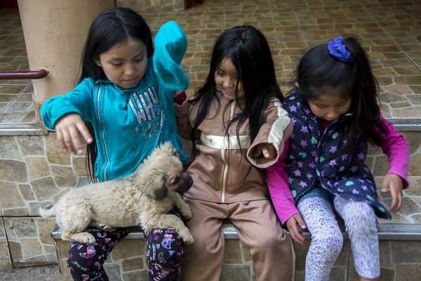Three young girls play with a puppy on the steps outside their family's restaurant in Agua Calientes--the town at the base of Machu Pichu.