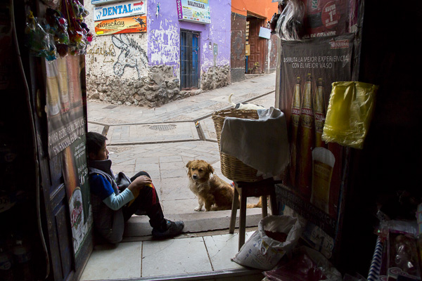 A boy and his dog keep each other company in the entranceway of the family's convenience store in Pisac.