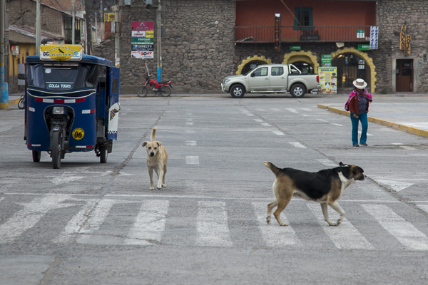 A dog crosses the street at the cross walk while another walks down the center of the street in the tiny town of Chivay.