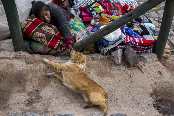 A young woman texts on her phone while waiting for customers at a tourist shop in Cuzco. I was touched by the little bed her dog slept on and the way in which she draped her arm around him as he slept.
