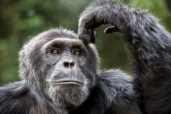 Male chimp, Rambo, scratches his chin. Chimp gestures and facial expressions are, unsurprisingly, so similar to humans’.