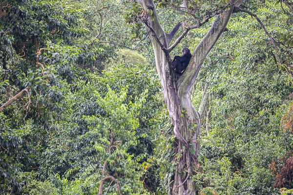A chimpanzee sits in the crook of a tree in Ngamba Island’s dense forest. The island is about 100 acres, 98 of which are forested.