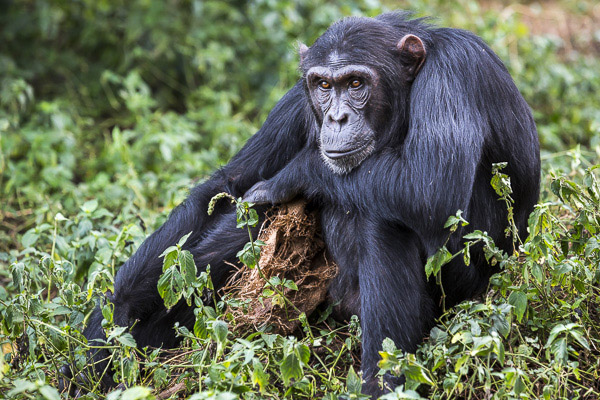 Kalema eats the leaves off a plant at the sanctuary. Like humans, chimps eat a variety of vegetables, leaves, fruit and animal protein. As Jane Goodall discovered during her well-known study of chimps in the 1960’s, chimps also use tools such as stones to crack nuts, twigs to probe for honey or ants and even spears to hunt small animals!