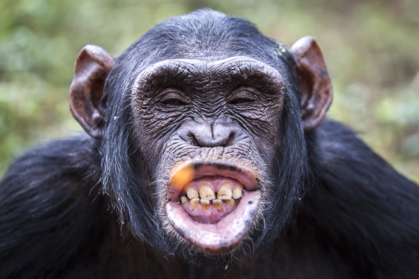 Female chimp, Medina, scrunches up her face as she tries to catch a piece of carrot in her mouth. When Medina arrived at Ngamba Island, her canine teeth had been removed and her front teeth smashed. She was malnourished with a bloated stomach and was believed to have worms. She was treated and recovered steadily and now is a friendly and generous chimp.