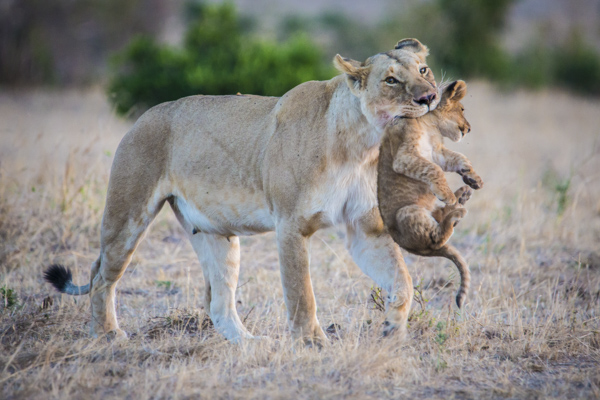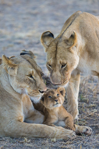 A two month-old lion cub looks up at two lionesses. Lionesses raise their cubs communally and cubs suckle indiscriminately from any lactating female.