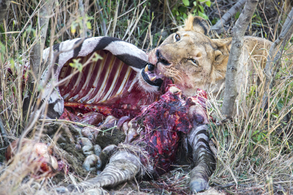 A lioness feeds on a freshly-killed zebra carcass. Lionesses are the hunters in the pride and co-ordinate with each other to surround their prey and stalk them before sprinting in a short burst, finally killing them by strangulation. They then share the weight of the kill on the journey back to the group where all the lions eat.