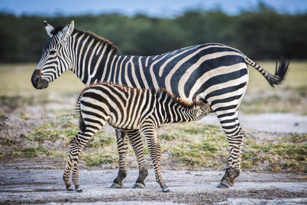 A zebra suckles her foal in Amboseli National Park. Baby zebras can begin running about one hour after they are born.