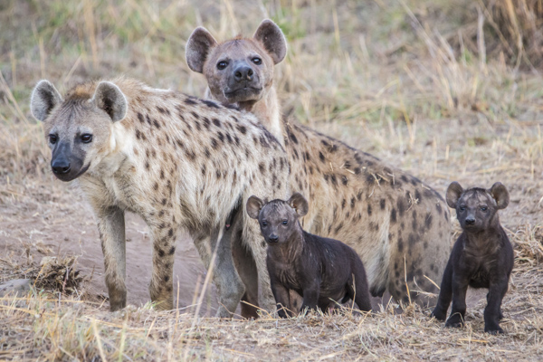Adult spotted hyenas and their week-old cubs are photographed near their den in the Masai Mara. Besides flesh, hyenas eat skin, bones, and even animal droppings. Surprisingly, hyenas are not related to dogs even though they look similar and have similar greeting ceremonies.