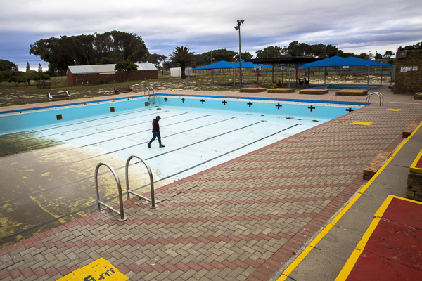A man walks across an empty public swimming pool–closed due to the water crisis–in the West Ridge district of Mitchell’s Plain on the outskirts of Cape Town.
