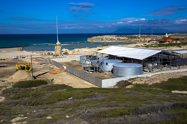 One of multiple private desalination plants sets up its temporary structure in Monwabisi on Cape Town’s False Bay. The plant, which was erected in a matter of months in reaction to the water crisis and is expected to produce seven million liters of drinkable water per day when it is complete, pulls water out of the ocean 1km out to sea near a popular pool and beach area.