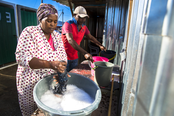 A woman washes clothing in a shallow bucket of water in Asanda Village–an informal shanty town settlement on the outskirts of Cape Town. Many of Cape Town’s poorer residents have pointed out that their communities–where residents don’t generally own washing machines, dishwashers and swimming pools–are not the ones using large amounts of water and yet are being penalized more than the wealthier communities where many residents have put in expensive boreholes (wells) and are thus skirting water restrictions.