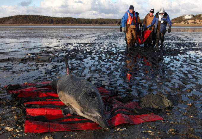 International Fund for Animal Welfare (IFAW) volunteer, Patty Walsh, monitors the breathing of a stranded common dolphin while behind her a team prepares to move anther dolphin to a waiting vehicle at Herring River in Wellfleet, MA.