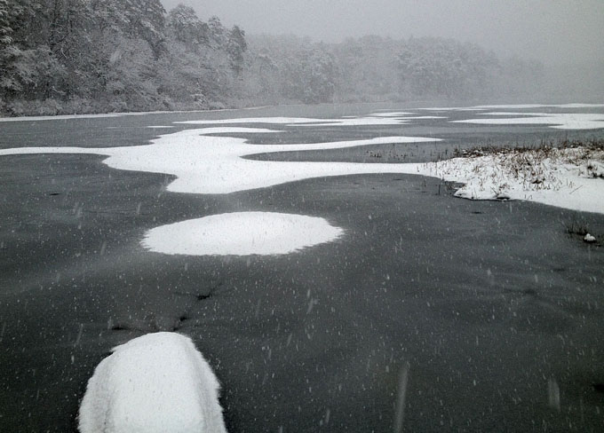 Snow covers the thin layer of ice in patches on Little Cliff Pond in Nickerson State Park, Brewster, MA.