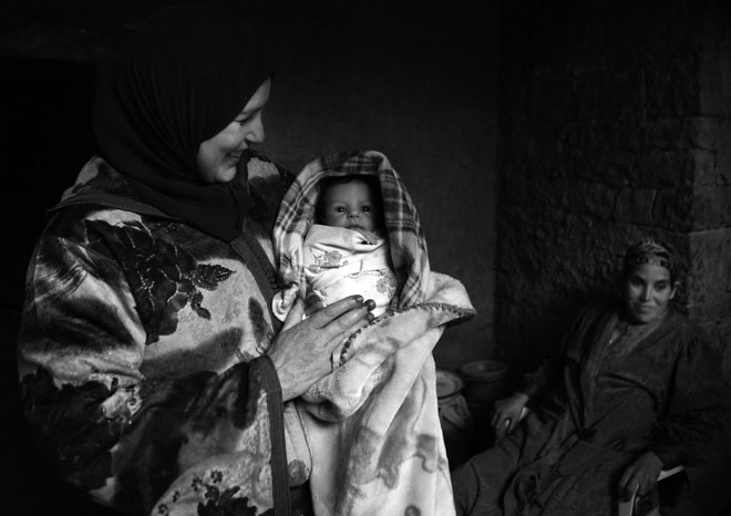Fatima holds her very young nephew in her family’s home in Tamda, Morocco. Right is her sister-in-law (the mother) who lives with her extended family in the home.