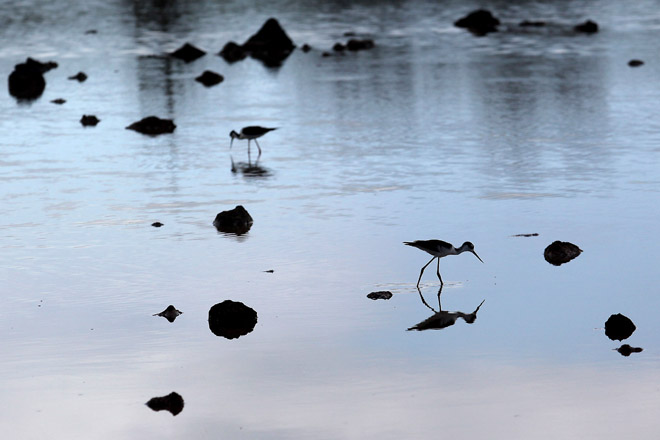 Two black-necked stilts forage for small crabs, fish and snails in a brackish pond on Dragon Hill Island.