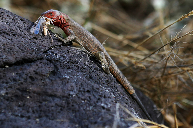 A female lava lizard makes a meal out of a dragonfly on Isabela Island.