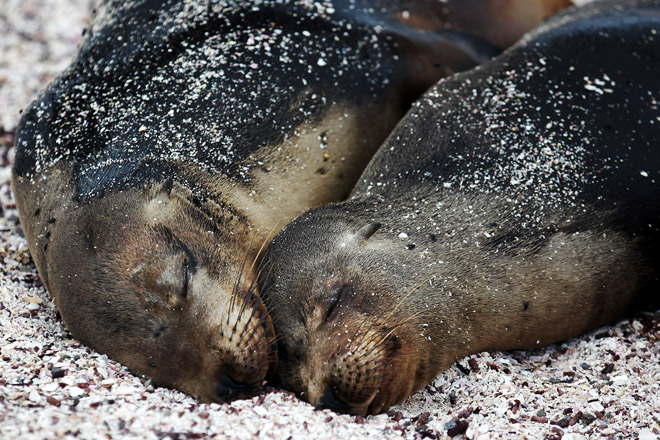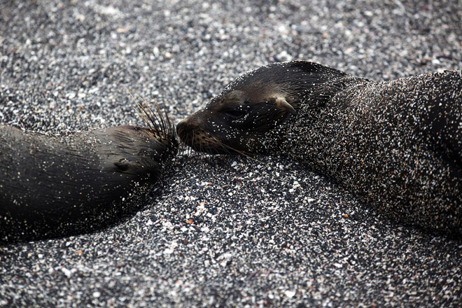 Two sea lions share a nose-to-nose moment on Fernandina Island.