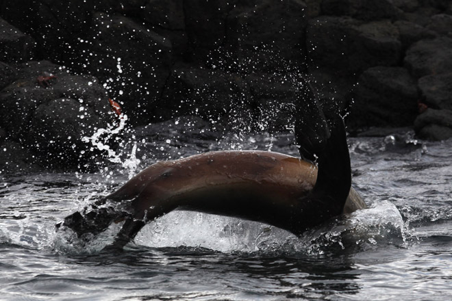 A Galapagos sea lion jumps playfully out of the water off the coast of Florian Island.