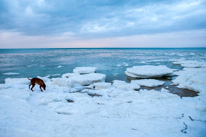 My dog, Winnie the Pooch, explores the icy landscape at Linnell Landing Beach in Brewster, MA.