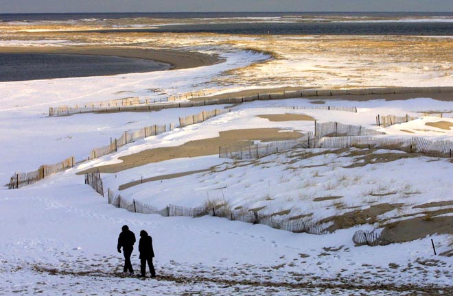 A couple walks on Lighthouse Beach after a snowstorm in Chatham, MA.