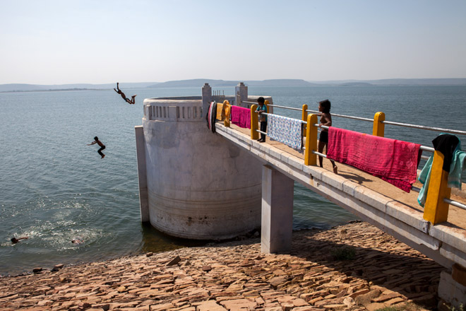 Two boys jump into the Jargu dam which irrigates farms in 59 surrounding villages in Uttar Pradesh, India.