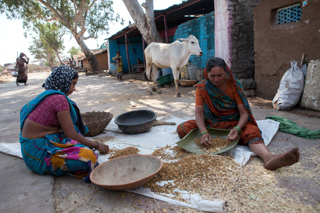A mother and daughter sort wheat in Mandu, India. Many of the people I photographed working together were family members, either working on their own small farm or together for a farmer.