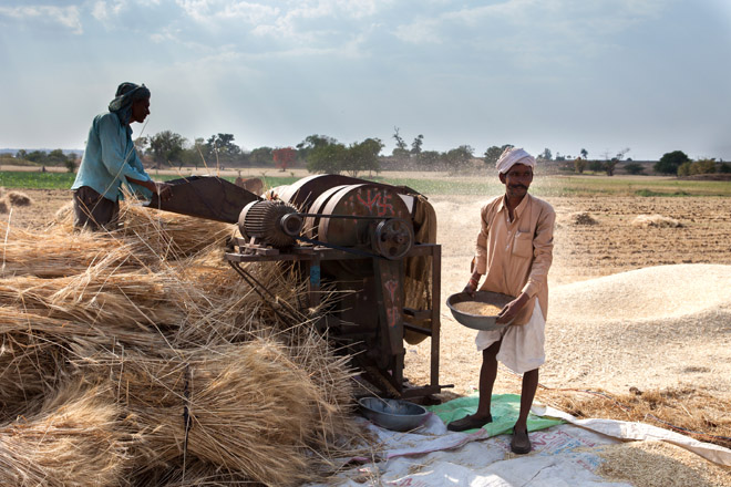 Agricultural workers prepare nylon ties to bundle harvested wheat in Manpur, India. I was struck by how many of India’s agricultural workers are women–apparently around 70%.