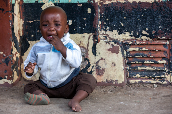 A young boy peeks around the corner of one of “Skomplaas” hostel’s crumbling buildings.