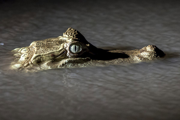 A spectacled caiman, also called a “white caiman”, hunts for food after dark in the Tambopata