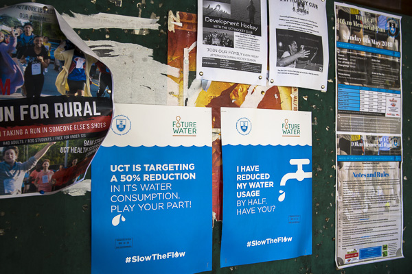 Signs from a public relations campaign to decrease the University of Cape Town’s water usage are plastered on a university bulletin board.