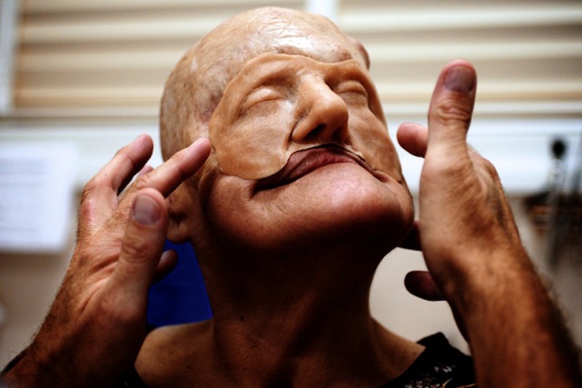 Amalia Mendoza turns her head as she is fitted with a wax prosthetic, a template for David Trainer to make a mold for her new face