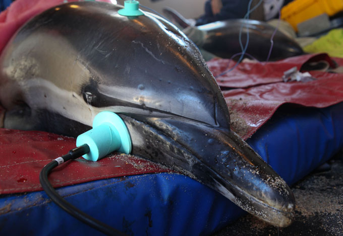 A rescued common dolphin is given a hearing test before being released back into Cape Cod Bay at Scusset Beach.