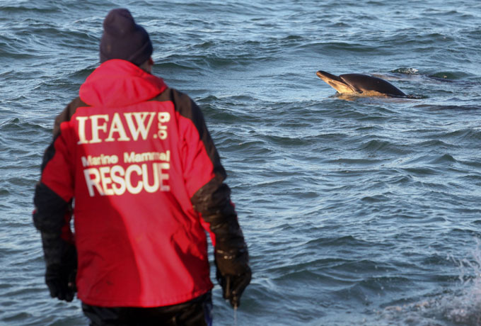 Director of the International Fund for Animal Welfare’s Emeregecy Relief Program, Ian Robinson, watches as a common dolphin swims off after being released.