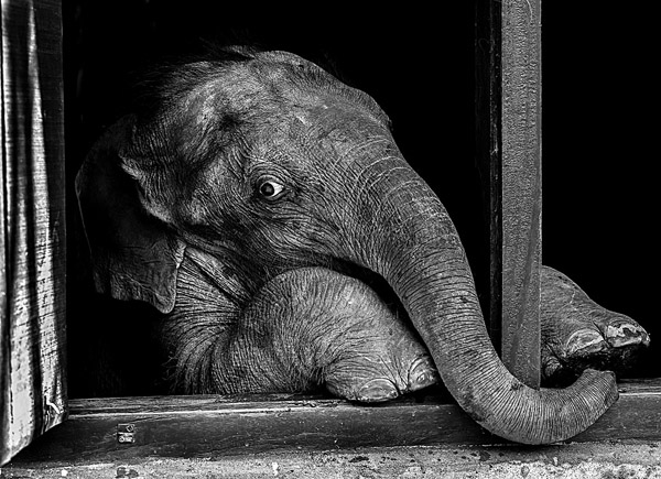 I photographed the little elephant many times during my stay there and by the time I left, I was completely charmed by him. On the last day before I left, I went to visit him for the final time to say goodbye. After I left, I turned around one more time to look at the building that housed the little elephant. I saw he had got up on his hind legs and was looking out the window directly at me. His expression was so strikingly human and profoundly expressive in that moment, I found myself feeling an intense connection. I made a few photos of him, struggling to leave. Later, when I saw this photo, I knew I would never see elephants in quite the same way again.