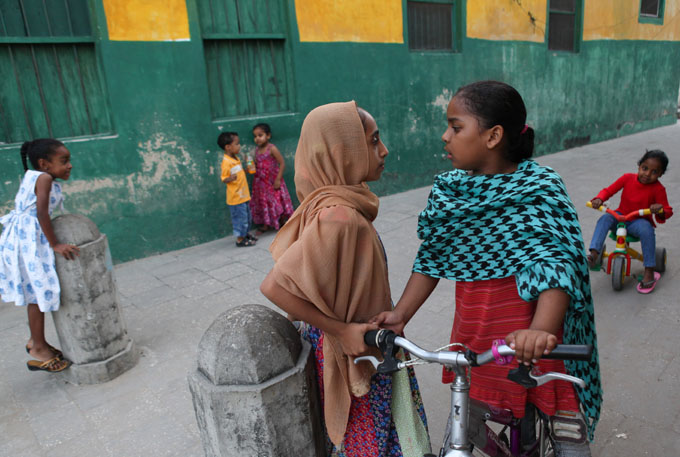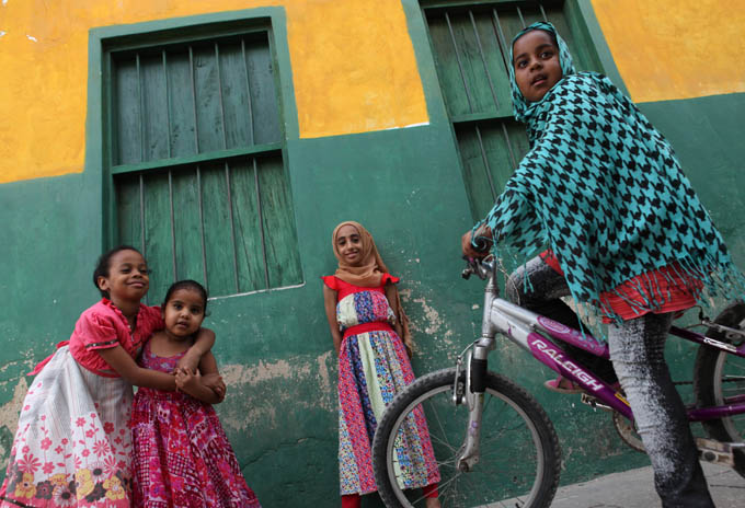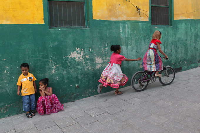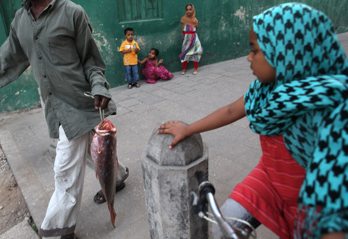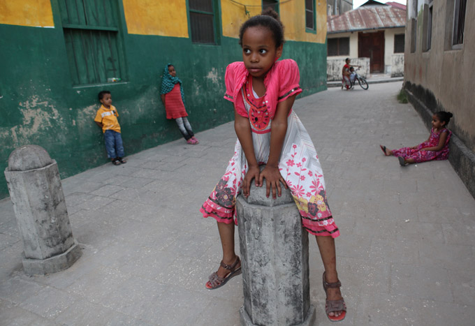 After winding my way through the maze of Stone Town’s narrow roads and alleyways, I found a group of children playing near a green and yellow wall. I was so struck by their brightly colored clothing, their interactions with one another and by the wall that I decided to hang around for a while.