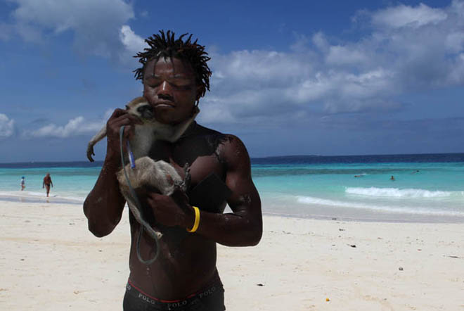 Because the sand is so white, the water looks as clear and blue as a swimming pool. A mix of traditional dhow boats and modern fishing boats bob on the water and signs advertise for massages and yoga. While Zanzibar’s Muslim culture means people generally cover up, here westerners walk around in bikinis and speedos, their skins tanned dark. Beach bar after beach bar offers exotic drinks and expensive food. A Zanzibarian man walks down the beach with a monkey on a leash, offering to be photographed with his simian friend for a dollar. When I photograph them, the two seem to be locked in some kind of ecstatic embrace. The atmosphere is definitely one of decadence and absolute relaxation.