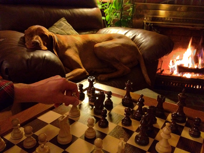 I love photography for its ability to capture the ordinary moments in life. Last night Mark and I were playing chess. We had a fire going and the dogs were lounging happily at our feet. It was about as cozy as it gets on a winter’s night.