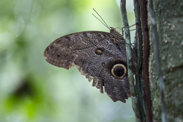 An owl butterfly--known for the large eye-spot patterns on its wings that resemble owl eyes--rests on a tree.