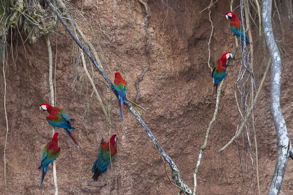 Red and green macaws gather on a clay lick along the Tambopata river. There are numerous theories as to why the birds consume the clay on an almost daily basis in the Amazon. One theory is that some foods eaten by macaws in the wild contain toxic substances which the clay they eat neutralizes.