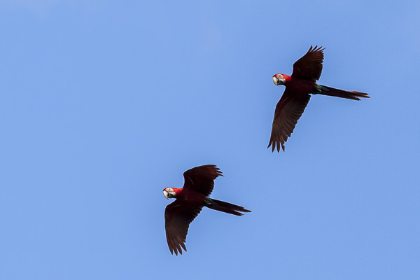 A pair of scarlet macaws fly off after visiting a clay lick. Macaws mate for life and are almost always seen flying with their mated pair.