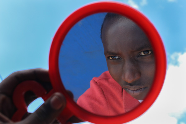 Self-portrait by Joshua Munyaburanga. Joshua calls this image “Two Brothers” as the boy on the right side of the frame is actually his brother, Sustain, while the face in the mirror is his own.